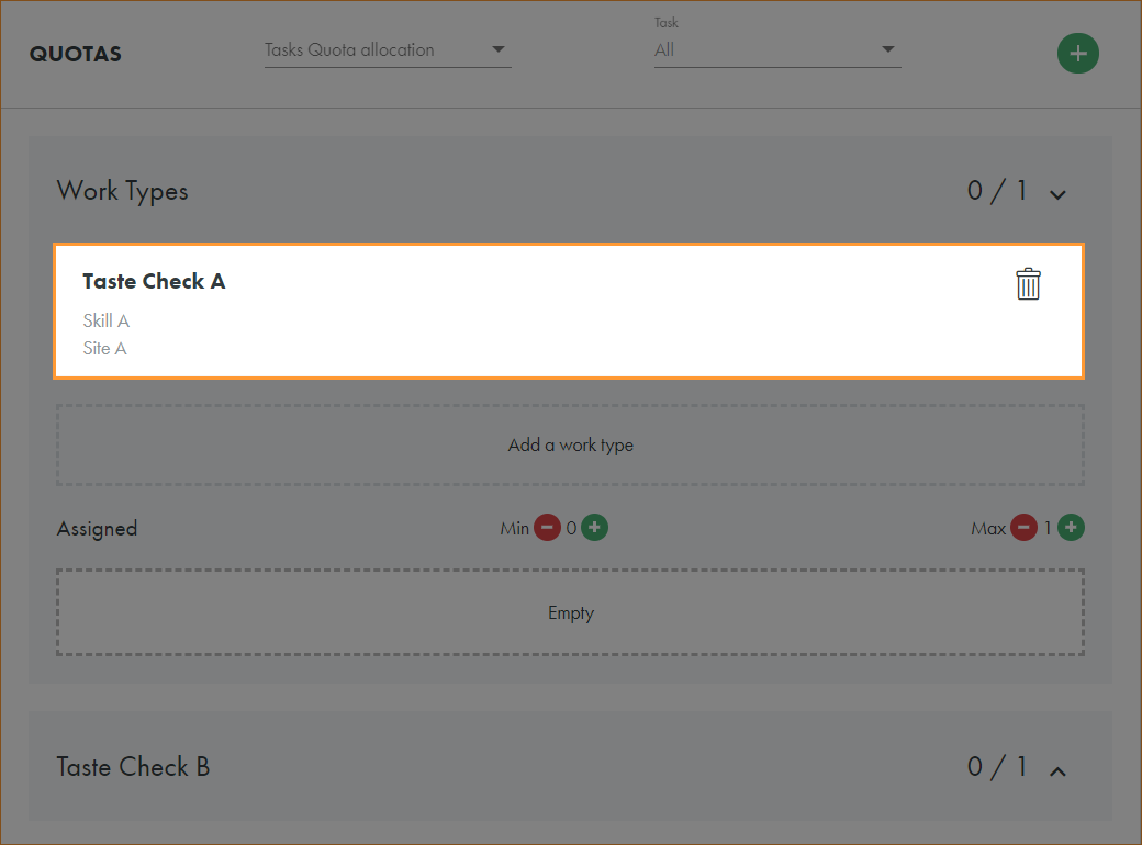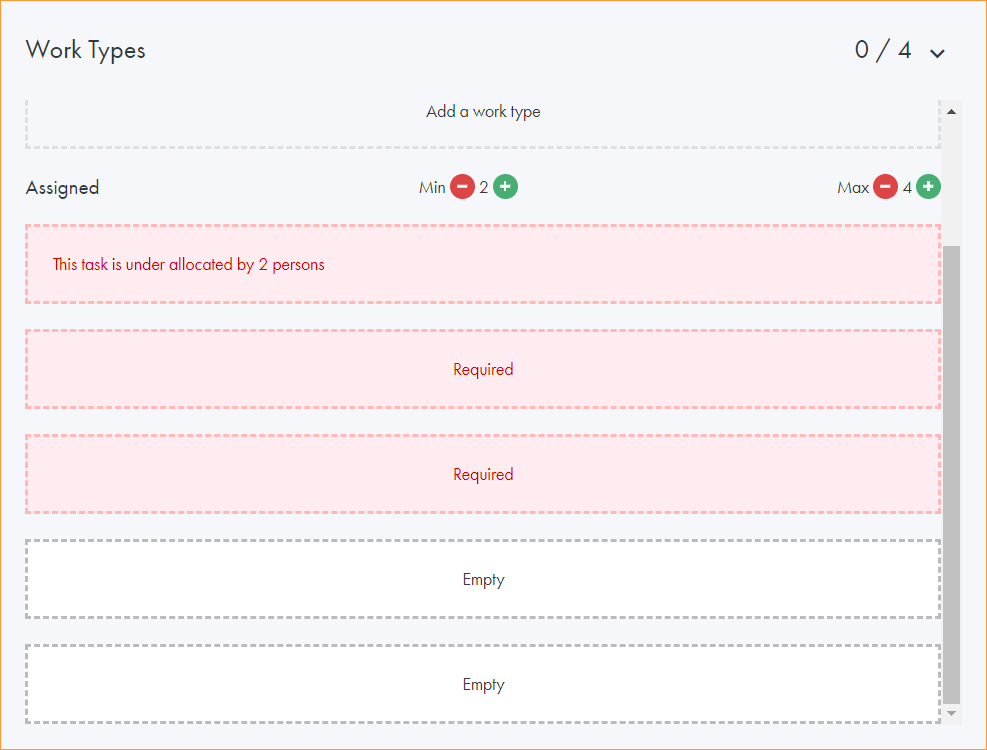icons to determine the minimum and maximum staffing quota required for this task: - You are now ready to assign staff to the task.
