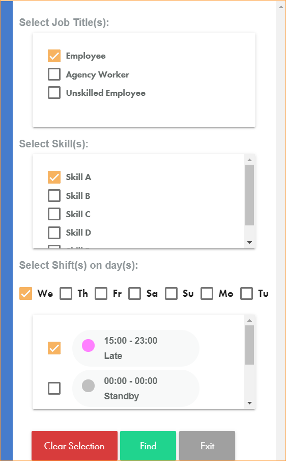 - Use the checkboxes in each section to select the Job Title, Skill and Shift that you want to search for. Search for multiples in any of these sections if required.