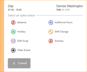 A Shift Swap is used when two employees agree to exchange their working, or non-working, days to attain a more preferable shift. This does not have any effect on the overall cover provided by the workforce as the total shift cover remains the same.