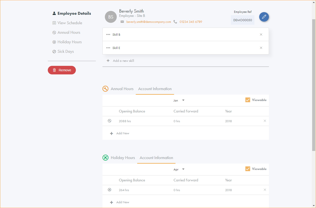 The employee’s email address and phone number are shown at the top of the screen.