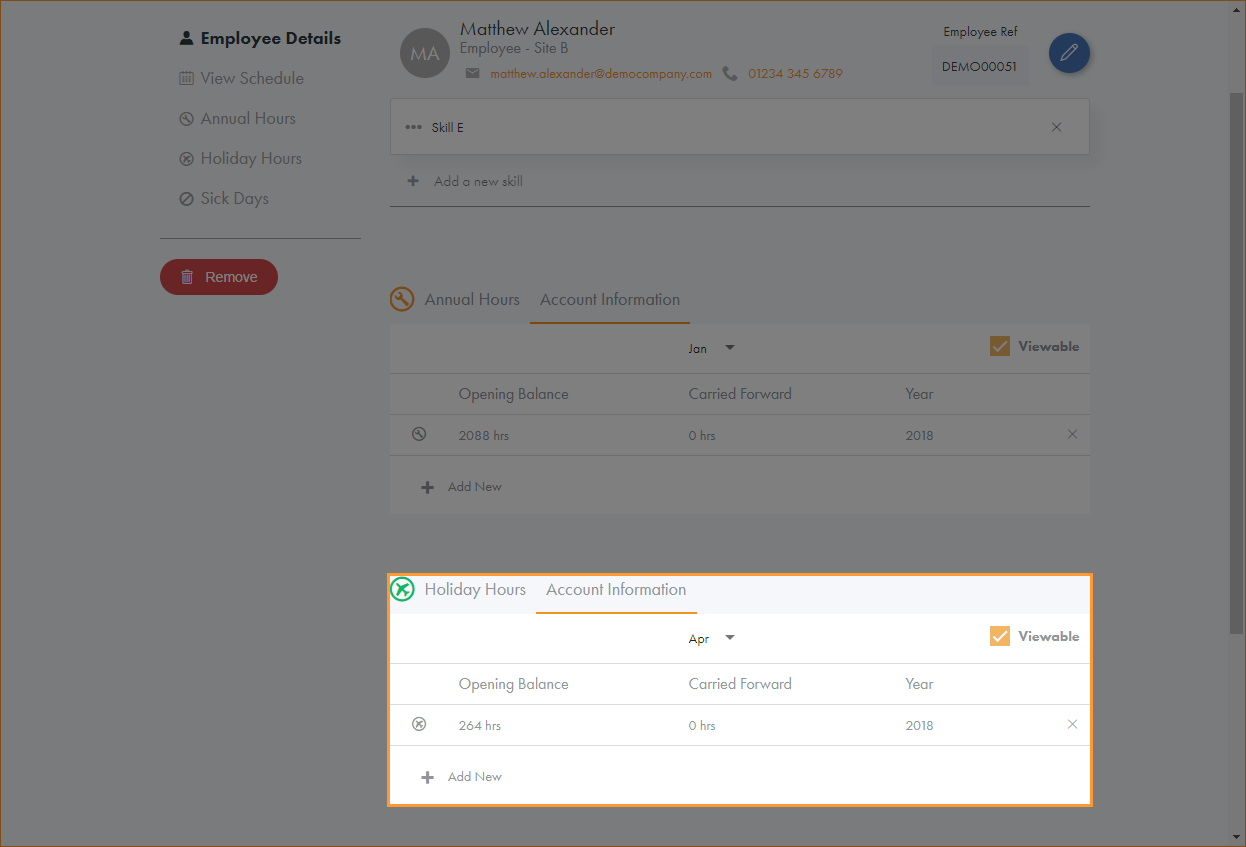 The accounts shown in this online help include Annual Hours, Holiday Hours and Sick Days. Accounts could also include overtime worked or number of shift swaps. There can be any number of accounts set up for different purposes and they can be measured in either hours or days.